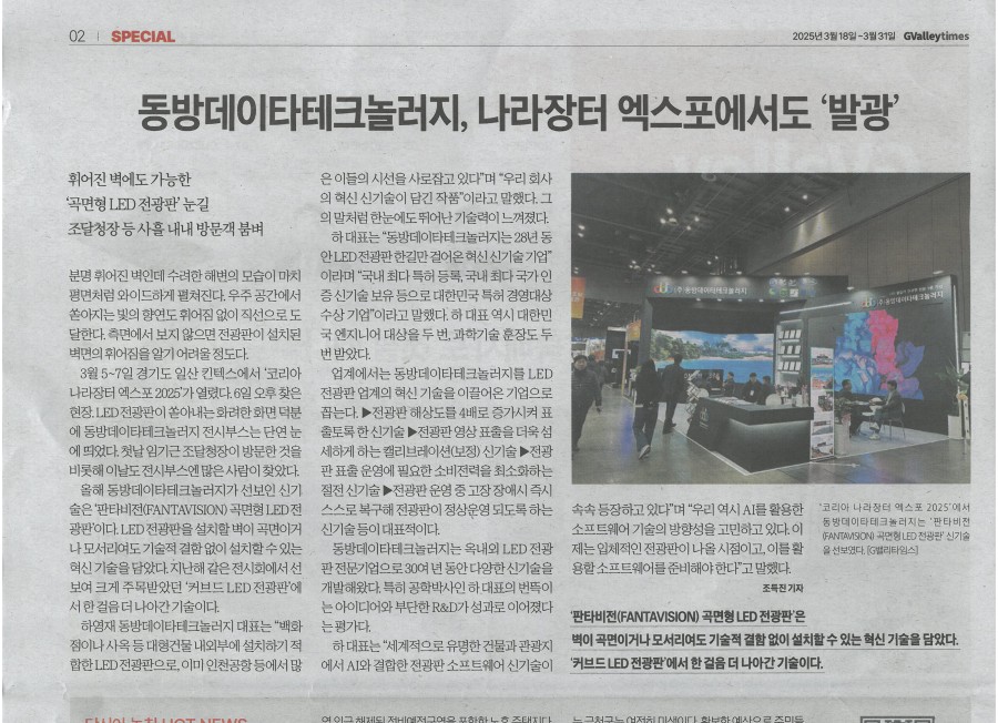 G밸리타임스 - 동방데이타테크놀러지, 나라장터 엑스포에서도 ‘발광’ 페이지 정보 작성자 관리자 조회1,632회 작성일 25-03-11 15:42 본문 https://www.gvalleytimes.com/news/articleView.html?idxno=889기사 원문은 링크를 통해 보실 수 있습니다. 목록