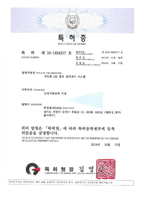 특허 및 실용신안 특허-제 10-1454317호-지능형 LED 램프 원격제어 시스템 페이지 정보 작성자 관리자 댓글 0건 조회 4,799회 작성일 24-05-13 13:29 목록 본문 이전글특허-제 10-1546417호-전력선 통신을 이용한 LED 가로등 MTF 제어장치 24.05.13 다음글특허-제 10-1454283호-무선 데이터 전송 기반의 엘이디 전광판 24.05.13