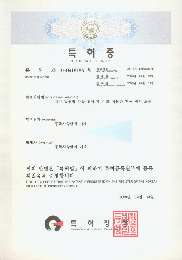 특허 및 실용신안 특허-제 10-0918188호-자가 발전형 진동 센서 및 이를 이용한 진동 센서 모듈