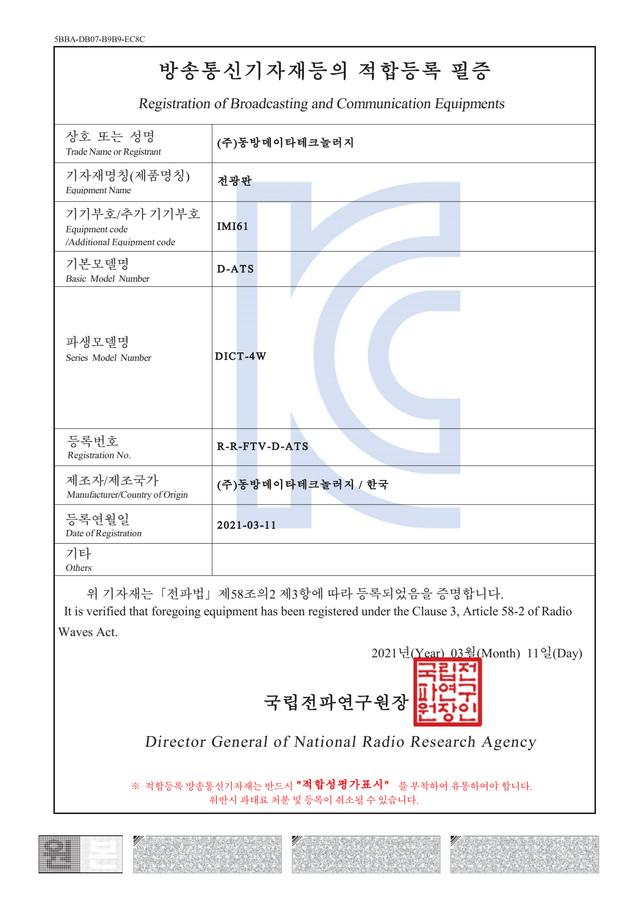 방송통신기자재등의 적합등록 필증-D-ATS