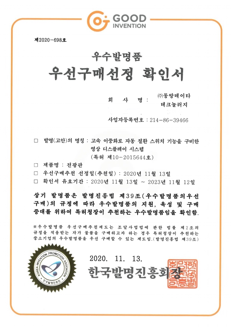 우수발명품 우선구매선정 확인 - DICT에 GSP가 적용된 4 Way 듀얼스캐닝 제어 전광판
