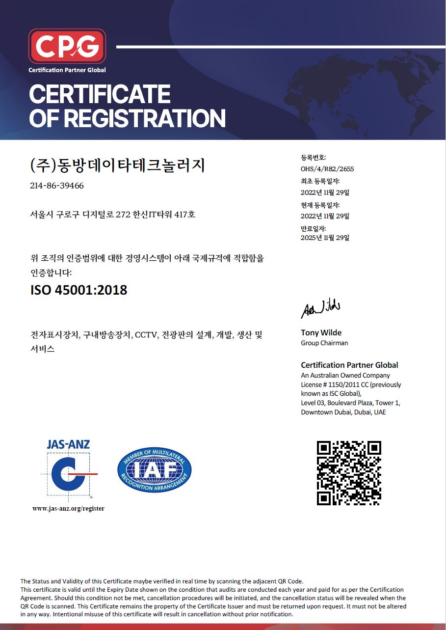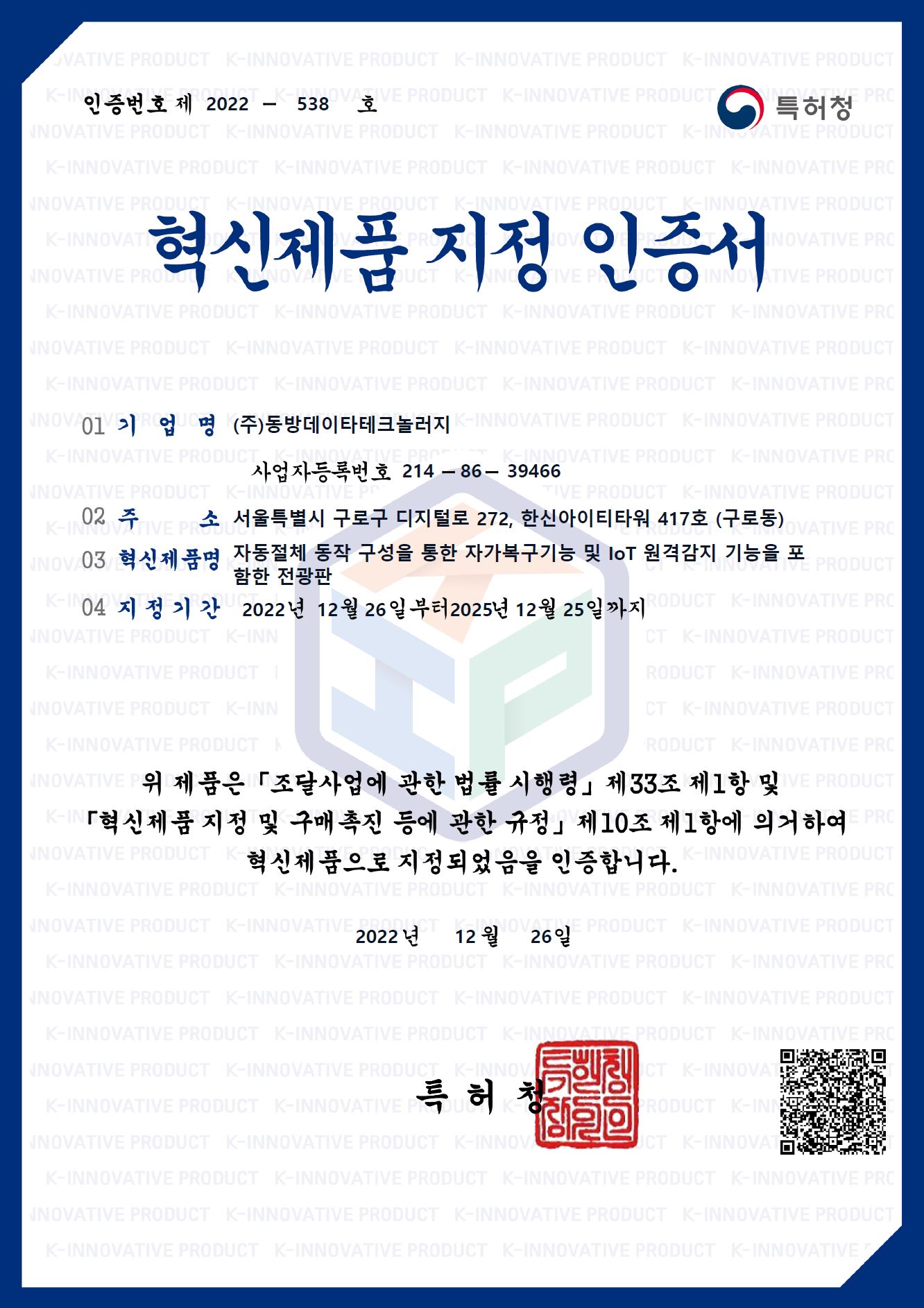 혁신제품 지정 인증-자동절체 동작 구성을 통한 자가복구기능 및 loT 원격감지 기능을 포함한 전광판~25년 12월 25일까지
