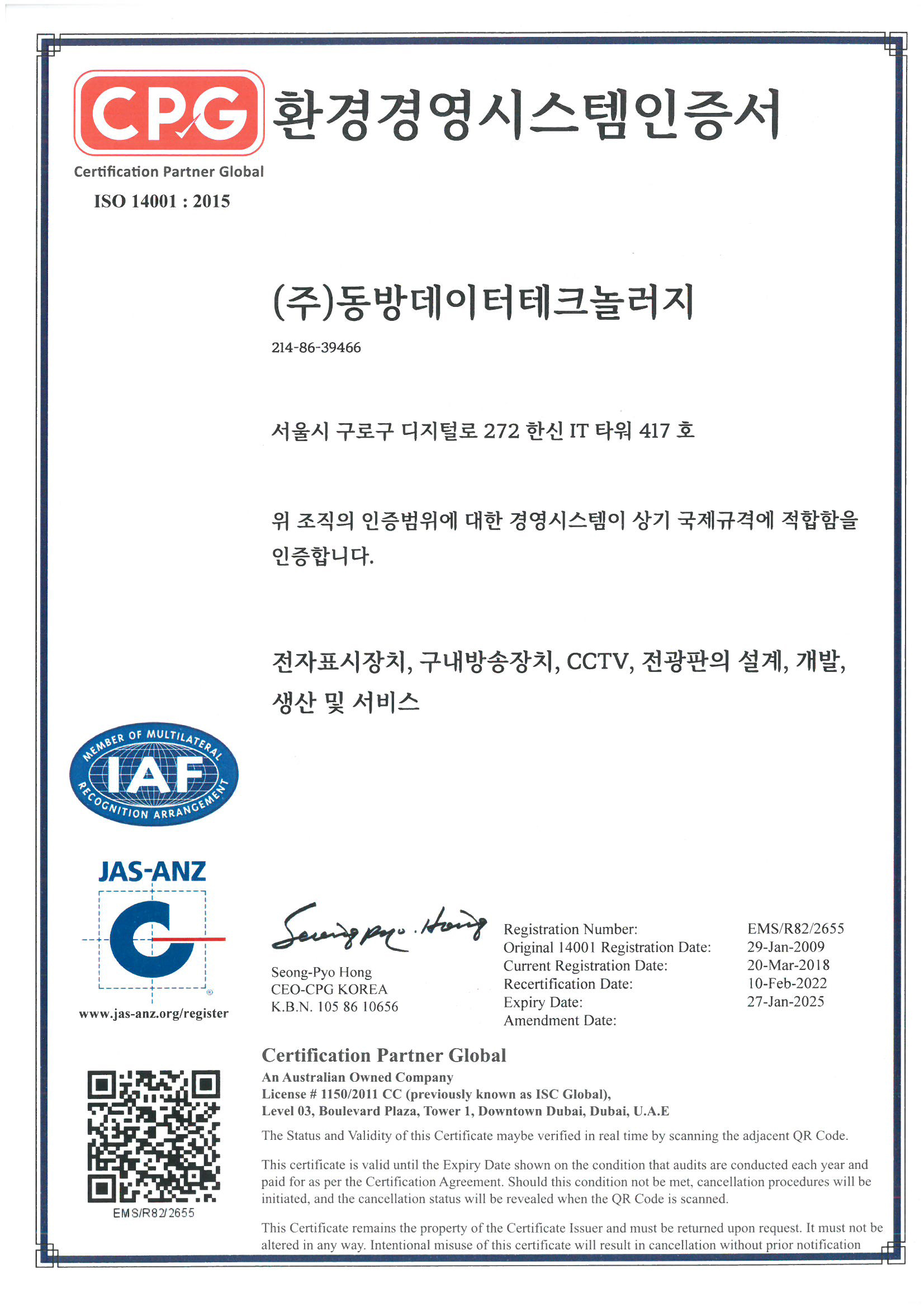 환경경영시스템인증서-ISO 14001 :2015