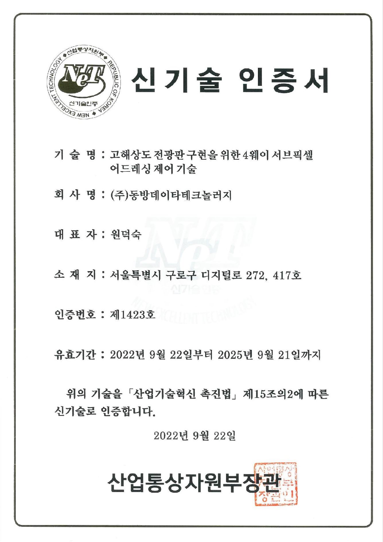 NET 신기술 인증 - 고해상도 전광판 구현을 위한 4웨이 서브픽셀 어드레싱 제어기술~25년 09월 21일까지