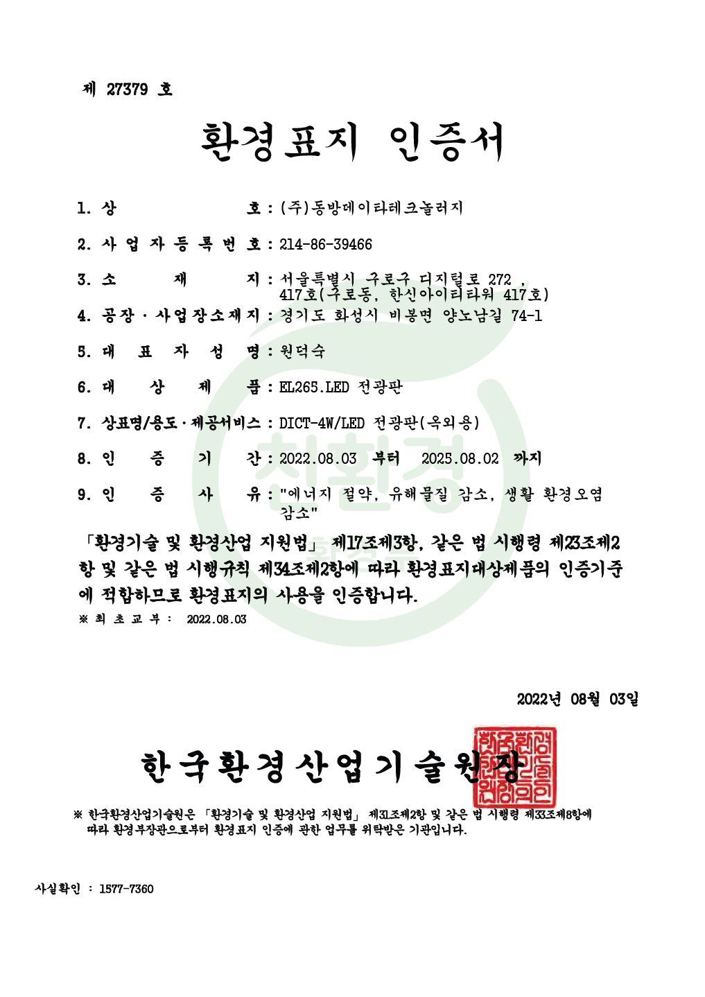 환경표지인증-DICT-4W/LED 전광판(옥외용)~25.08.02