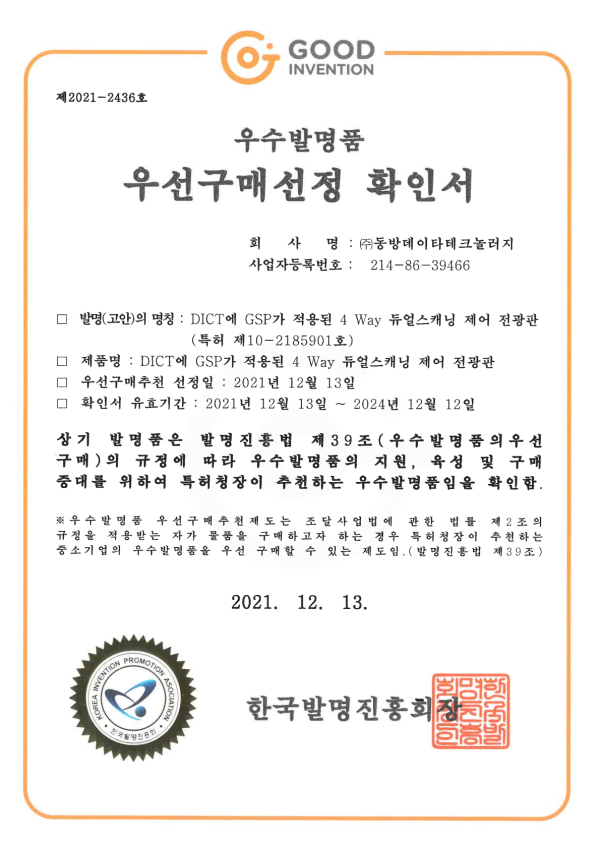 인증 및 등록현황 우수발명품 우선구매선정 확인 - DICT에 GSP가 적용된 4 Way 듀얼스캐닝 제어 전광판 페이지 정보 작성자 관리자 댓글 0건 조회 5,444회 작성일 24-05-14 10:45 목록 본문 이전글품질경영시스템인증서-ISO 9001:2015 24.05.14 다음글소프트웨어공제조합 등록 24.05.14