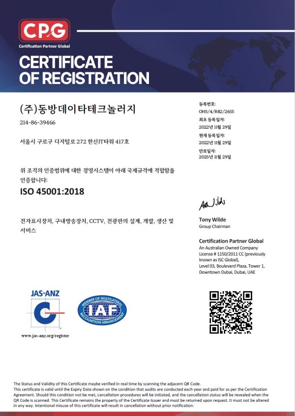 인증 및 등록현황 ISO 450001:2018 페이지 정보 작성자 관리자 댓글 0건 조회 5,613회 작성일 24-05-14 11:08 목록 본문 이전글ICT 기술마켓 인증기술 인증 24.05.14 다음글혁신제품 지정 인증-자동절체 동작 구성을 통한 자가복구기능 및 loT 원격감지 기능을 포함한 전광판~25년 12월 25일까지 24.05.14