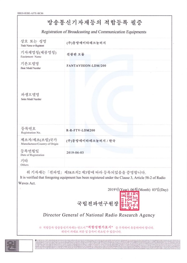 인증 및 등록현황 방송통신기자재등의 적합등록 필증-FANTAVISION-LDM/160/200/312