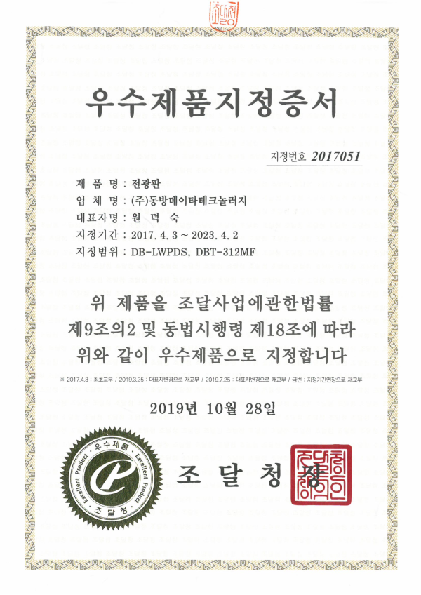 인증 및 등록현황 조달우수제품지정-2023년 까지 페이지 정보 작성자 관리자 댓글 0건 조회 5,388회 작성일 24-05-14 10:34 목록 본문 이전글우수발명품 우선구매선정-특허 제10-1737437호 24.05.14 다음글기술혁신형 중소기업 확인서-A등급 24.05.14