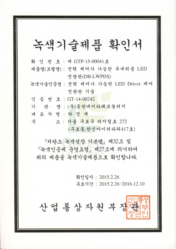인증 및 등록현황 녹색기술제품 확인-제 GTP-15-00041호 페이지 정보 작성자 관리자 댓글 0건 조회 5,750회 작성일 24-05-14 10:05 목록 본문 이전글전자파적합등록-전광판 FANTAVISION OD1 24.05.14 다음글성능인증-SINGLE LINE 스캔기반의 저전력 구동 기술을 적용한 전광판 [FANTAVISION-128F,160F,240S,300S,320S] 24.05.14