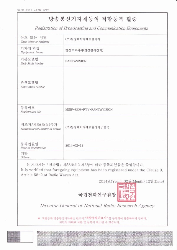 인증 및 등록현황 EMC 영상프로세서 적합 등록-FANTAVISION 페이지 정보 작성자 관리자 댓글 0건 조회 5,771회 작성일 24-05-14 10:12 목록 본문 이전글조달우수제품지정 24.05.14 다음글전자파인증-전광판 300mm 24.05.14