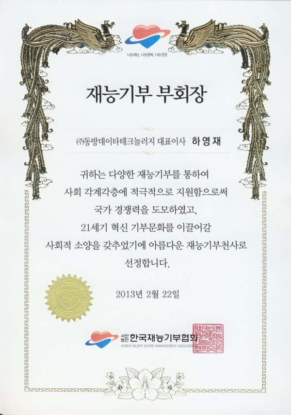 표창 및 수상내역 한국재능기부협회 - 재능기부천사 페이지 정보 작성자 관리자 댓글 0건 조회 5,380회 작성일 24-05-13 16:18 목록 본문 이전글구로구 사회적기업육성위원회 위원 위촉장 24.05.13 다음글지식경영인 대상(기술제조산업부문) 24.05.13