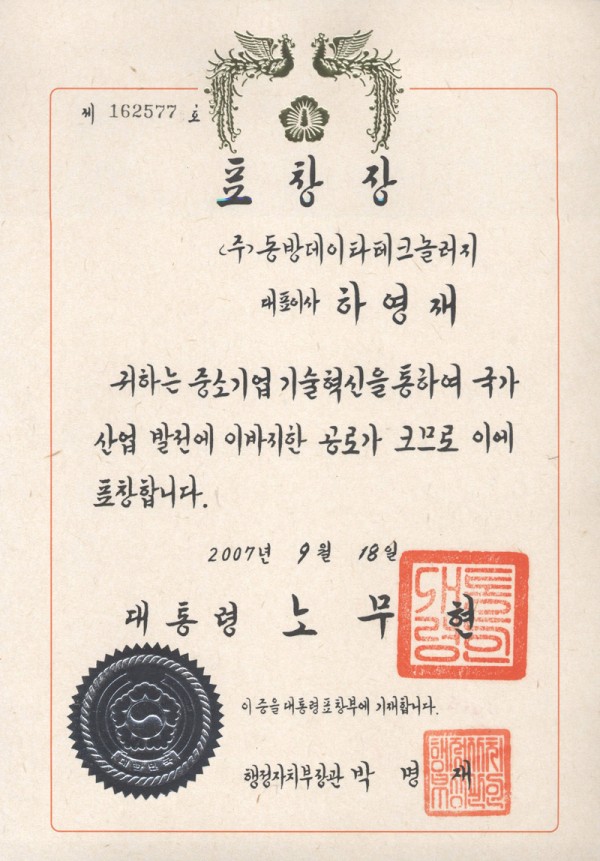 표창 및 수상내역 기술혁신대전 대통령상 페이지 정보 작성자 관리자 댓글 0건 조회 4,885회 작성일 24-05-13 15:54 목록 본문 이전글산업자원부 장관상 24.05.13 다음글서울체신청장 표창 24.05.13