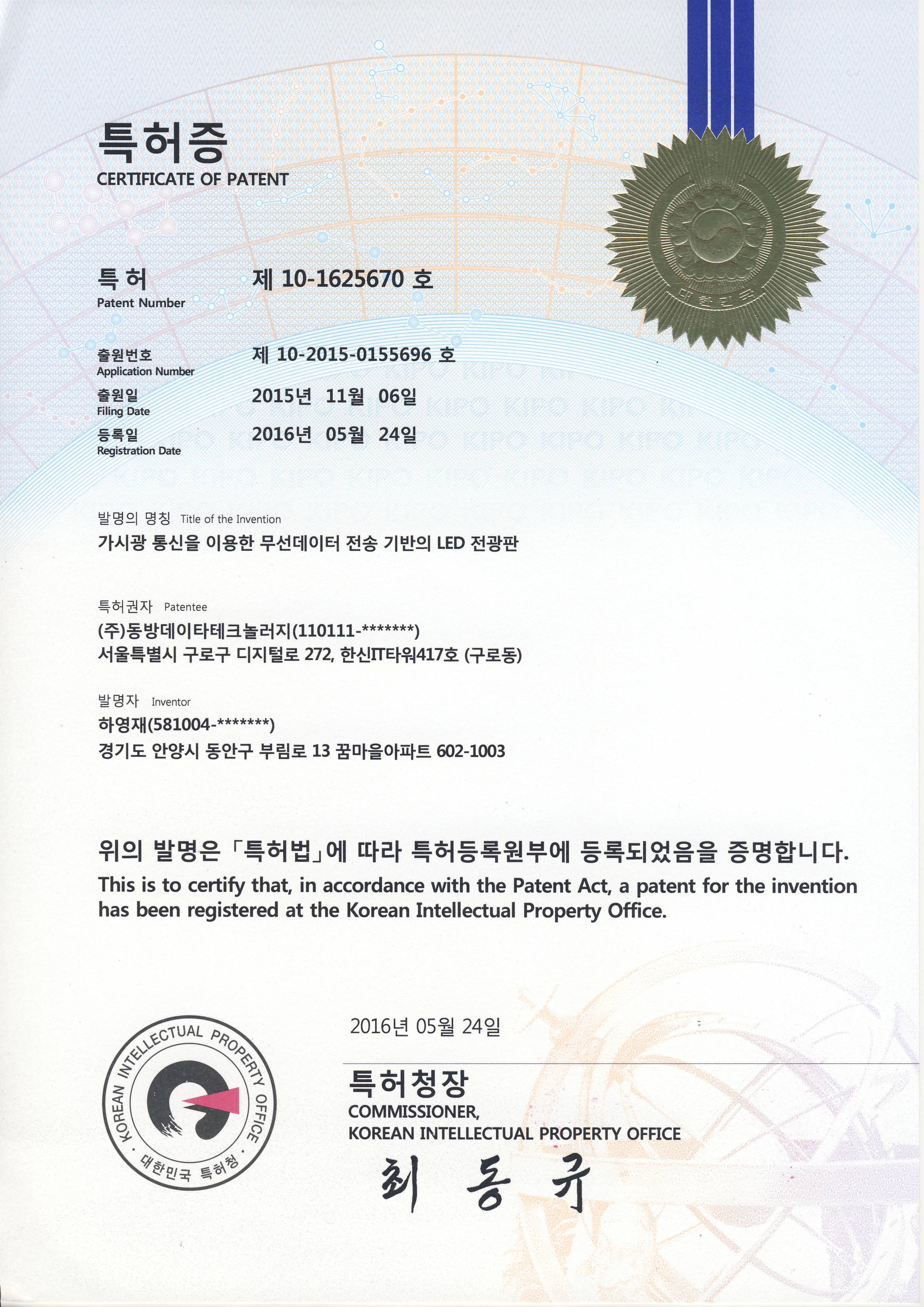 특허-제 10-1625670호-가시광 통신을 이용한 무선데이터 전송 기반의 LED 전광판