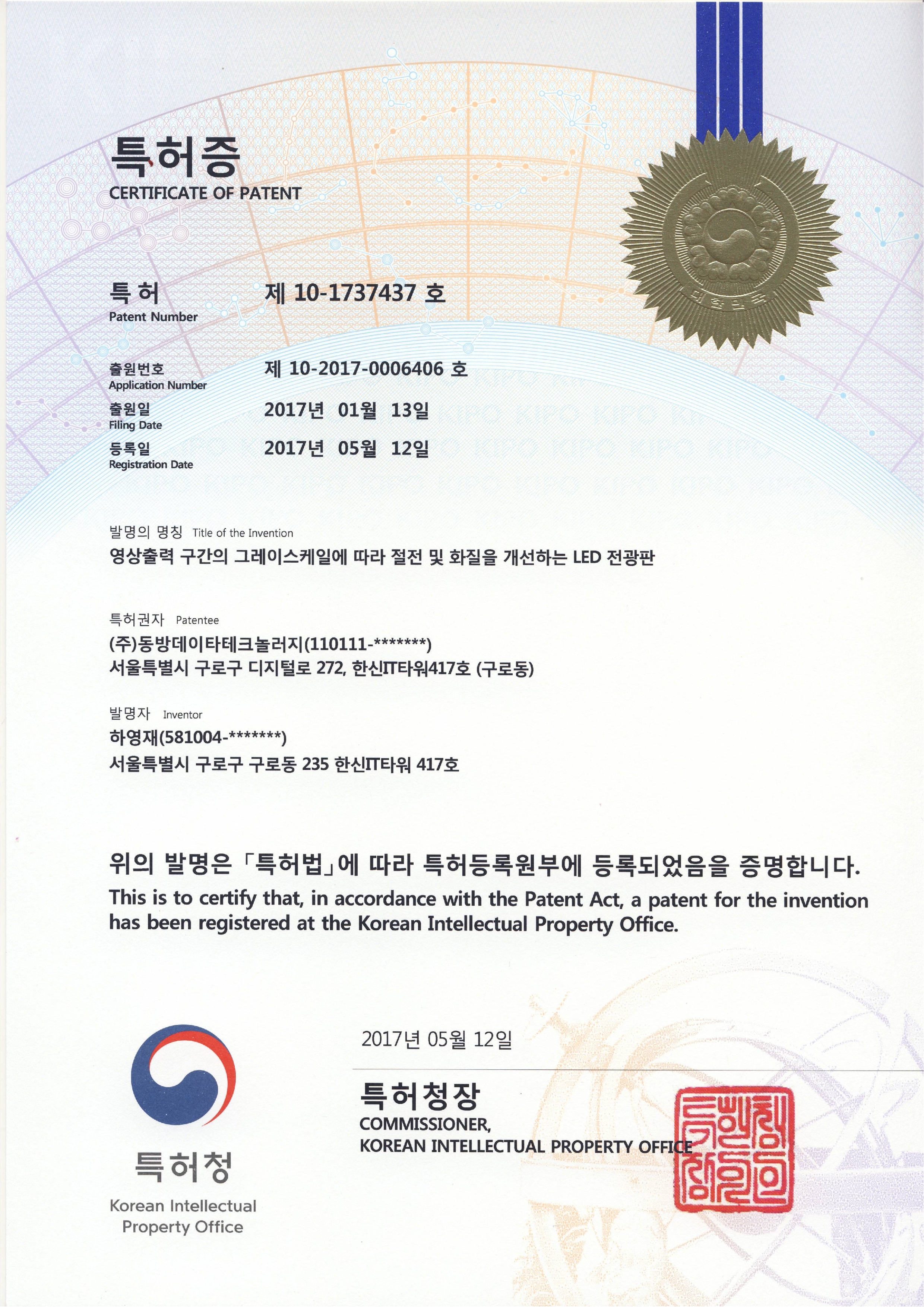 특허-제 10-1737437호-영상출력 구간의 그레이스케일에 따라 절전 및 화질을 개선하는 LED 전광판