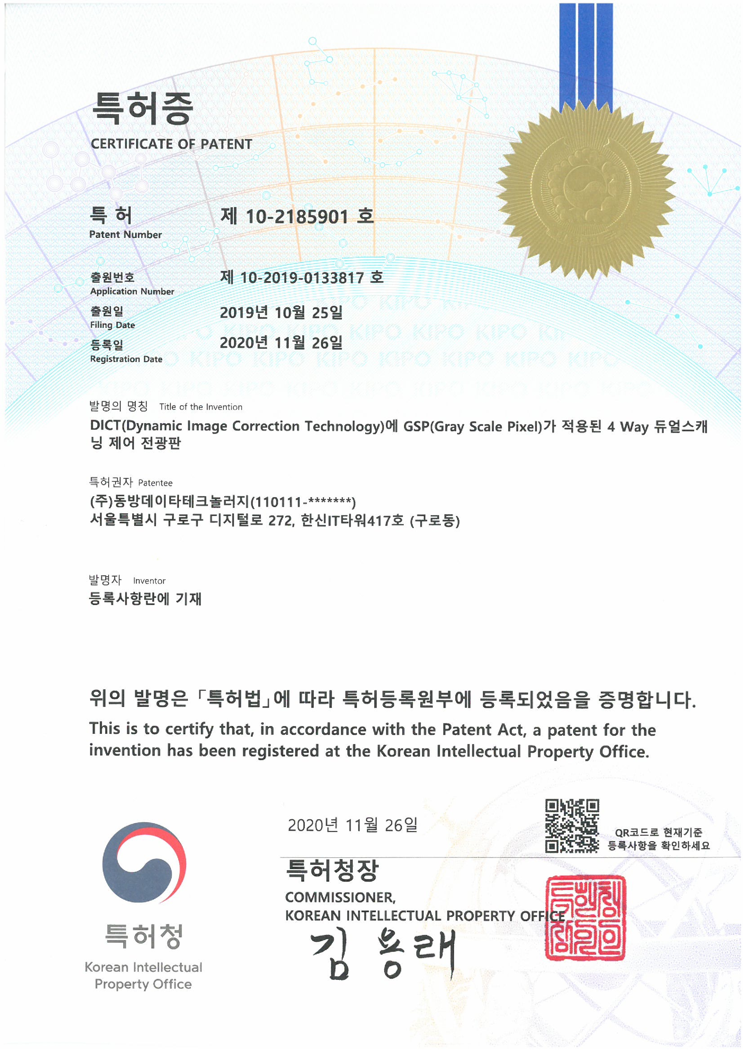 특허-제 10-2185901호-DICT에 GSP가 적용된 4 Way 듀얼스캐닝 제어 전광판