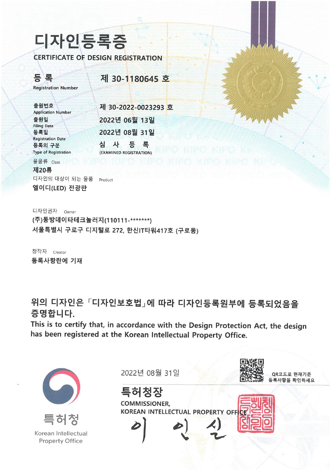 디자인등록-제 30-1180645호-엘이디(LED)전광판