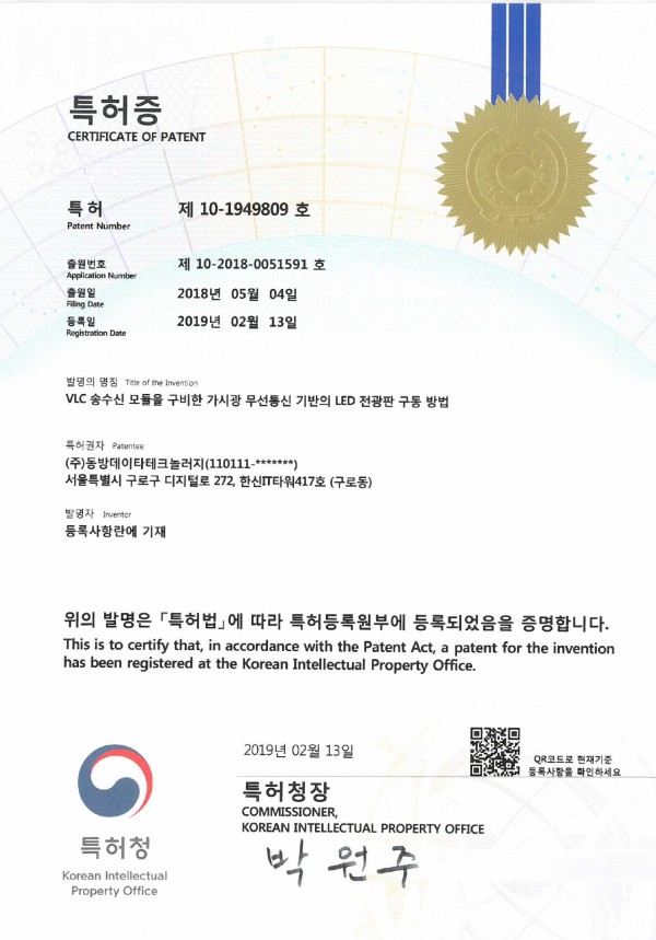 특허 및 실용신안 특허-제 10-1949809호-VLC송신 모듈을 구비한 가시광 무선통신 기반의 LED 전광판 구동방법 페이지 정보 작성자 관리자 댓글 0건 조회 4,689회 작성일 24-05-13 13:34 목록 게시판 리스트 옵션 검색 본문 이전글특허-제 10-1954713호-VLC송신 모듈을 구비한 가시광 무선통신 기반의 LED 전광판 시스템 24.05.13 다음글특허-제 10-1737437호-영상출력 구간의 그레이스케일에 따라 절전 및 화질을 개선하는 LED 전광판 24.05.13