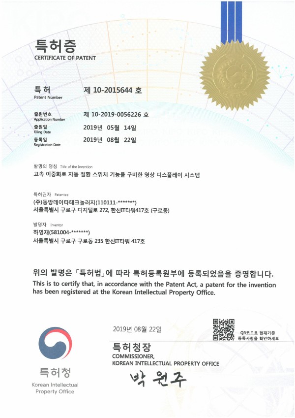 특허 및 실용신안 특허-제 10-2015644호-고속 이중화로 자동 절환 스위치 기능을 구비한 영상 디스플레이 시스템 페이지 정보 작성자 관리자 댓글 0건 조회 4,989회 작성일 24-05-13 13:38 목록 게시판 리스트 옵션 검색 본문 이전글특허-제 10-2185901호-DICT에 GSP가 적용된 4 Way 듀얼스캐닝 제어 전광판 24.05.13 다음글특허-제 10-1954713호-VLC송신 모듈을 구비한 가시광 무선통신 기반의 LED 전광판 시스템 24.05.13