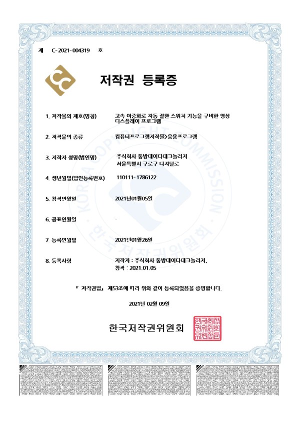 프로그램 등록 저작권등록-고속 이중화로 자동 절환 스위치 기능을 구비한 영상 디스플레이 프로그램 페이지 정보 작성자 관리자 댓글 0건 조회 4,644회 작성일 24-05-13 14:56 목록 게시판 리스트 옵션 검색 본문 이전글저작권등록 - 재난문자 DICT(디아이시티) 4Way(포웨이) 표출프로그램 24.05.13 다음글저작권 등록-GSP(그레이 스케일 픽셀)영상 보정 시스템 24.05.13