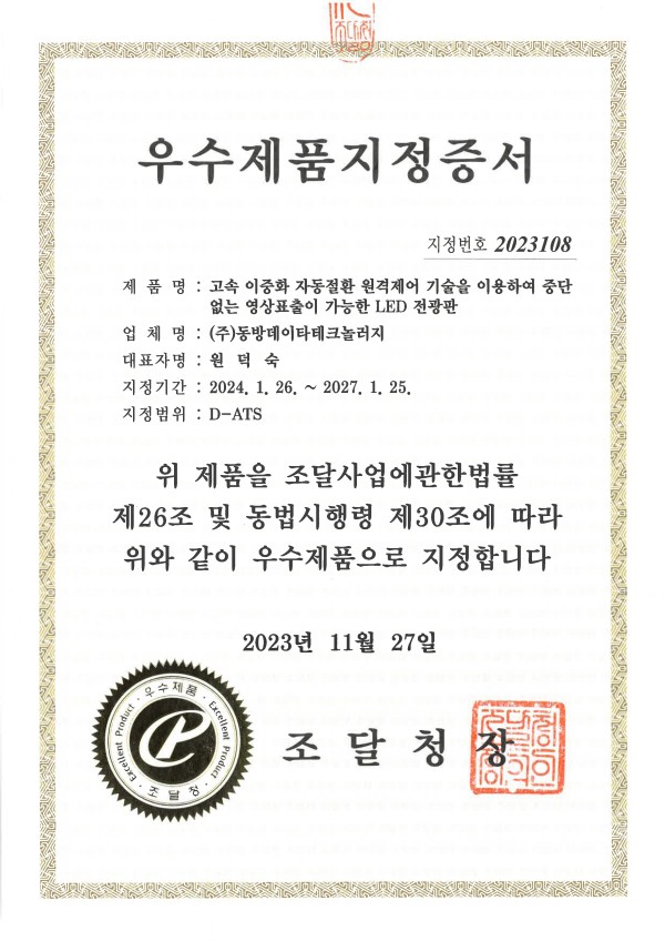 인증 및 등록현황 조달우수제품 지정-고속이중화자동절환 원격제어 기술을 이용하여 중단없는 영상표출이 가능한 LED 전광판 ~27.01.25 페이지 정보 작성자 관리자 댓글 0건 조회 5,600회 작성일 24-05-14 11:15 목록 본문 이전글방송통신기자재등의 적합등록 필증 - LED 전광판 24.05.14 다음글Hi-Seoul 기업 지정 24.05.14