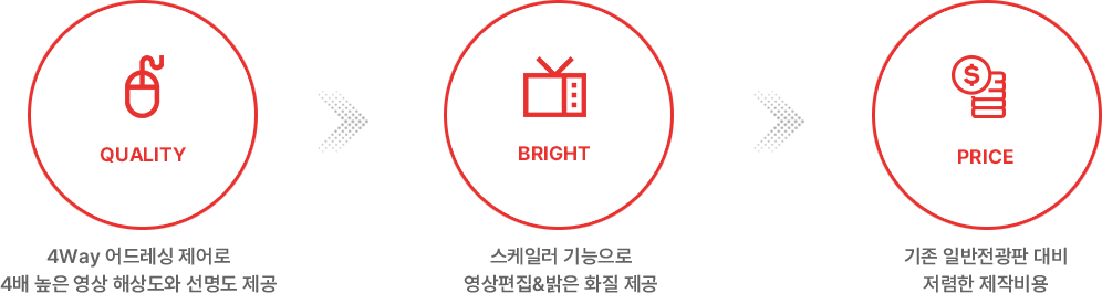 4Way 서브픽셀 어드레싱 제어기술을 적용하여 더욱 선명한 해상도를 가진 전광판으로 고해상 표출 화면을 제공하여 고선명 표출화면을 구현하는 혁신적인 전광판 구동 신기술입니다.